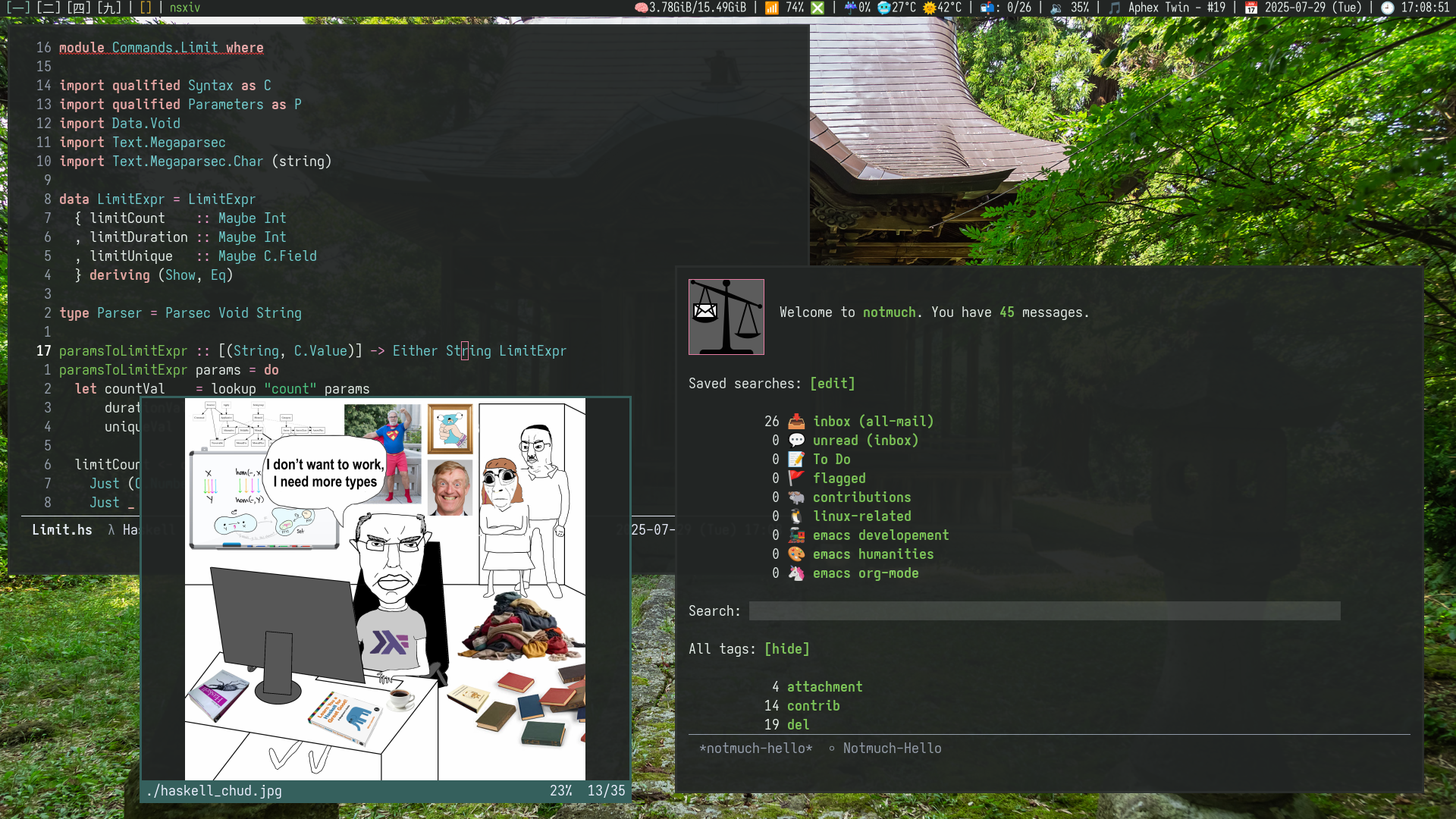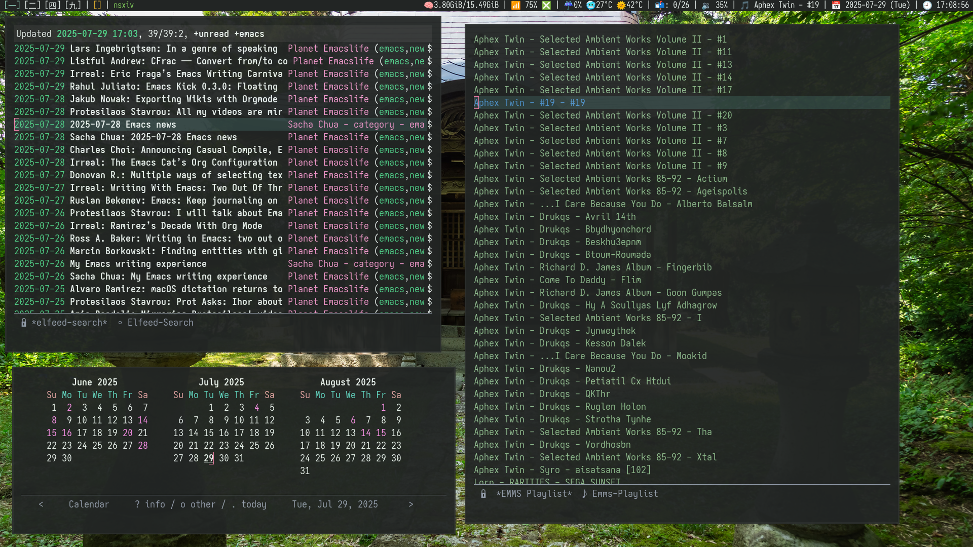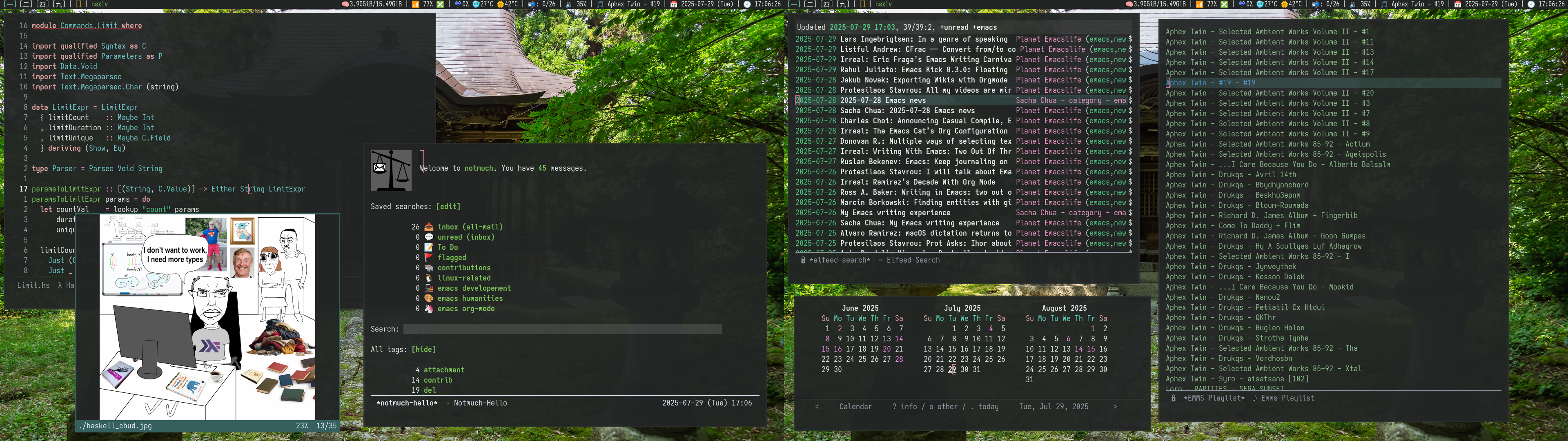 Open windows (L-> R): Emacs with conductor project, nsxiv, Emacs with notmuch, Emacs with Elfeed, Emacs calendar, Emacs with EMMS.
