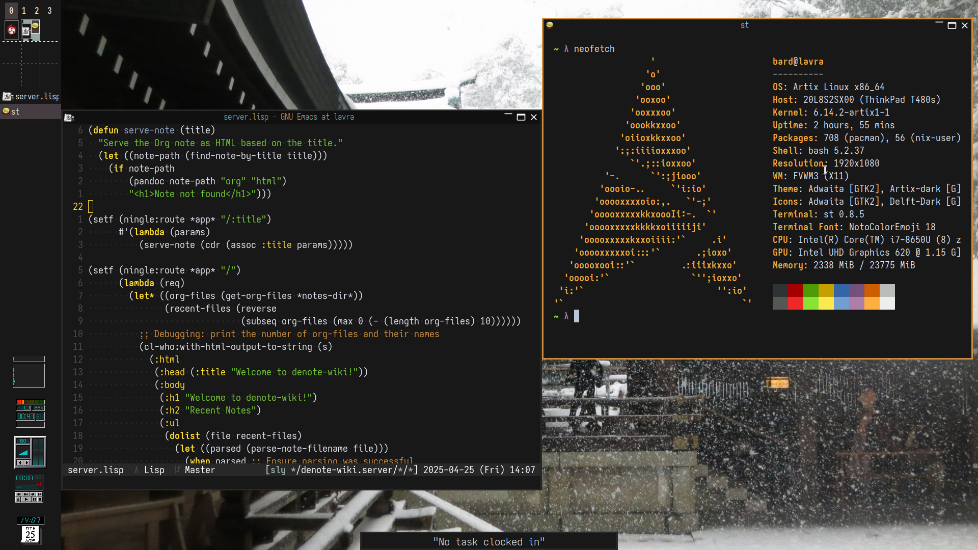 The windows shown are Emacs with a lisp project open (so I can look super productive) and a terminal running fastfetch (I have it aliased to neofetch). I finally wrote an Fvwm colorset when I figured out which colors I like for