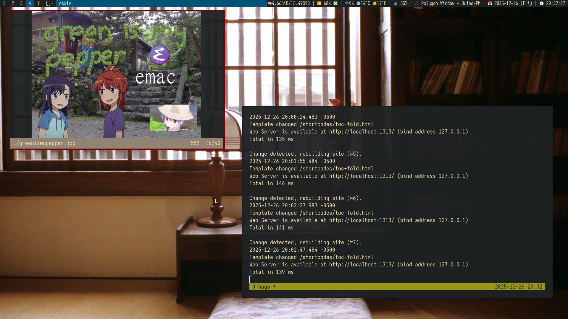 nsxiv and st terminal running tmux (serving hugo site)