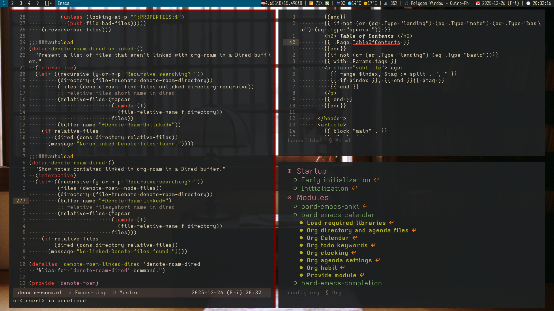 Emacs lisp buffer opening my denote-roam Emacs package, html file, literate Emacs configuration.