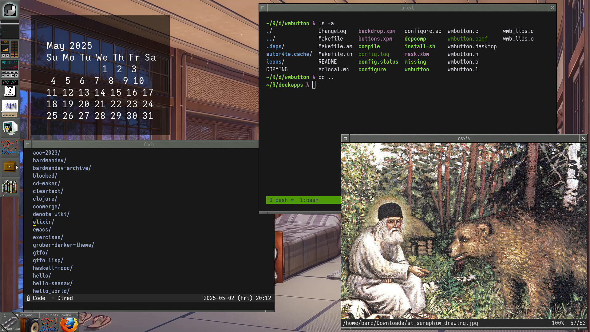 I have been toying around with WindowMaker for around a week. My favorite feature (unsurprisingly if you check the post below) would be the dock. I also how it feels like if FVWM without all the extensibility and more desktop-environmenty. At first I found the icons to be really annoying, but I finally figured it out. The open windows are Emacs dired, nsxiv image viewer and URxvt with tmux. The wallpaper is doctored with the calendar generated by my wallpaper-annotate.sh