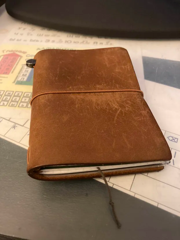 I got this as a present for my 18th birthday to myself. It has Midori MD paper from the traveller's company inserts. It has one plain unlined paper and another with graph paper. I use the blank one for reminders, todo lists, and important dates or deadlines. The graph notebook is for long term notes from meetings or presentations at school. I also have a plastic wallet insert, which I use to store papers, business cards, etc.