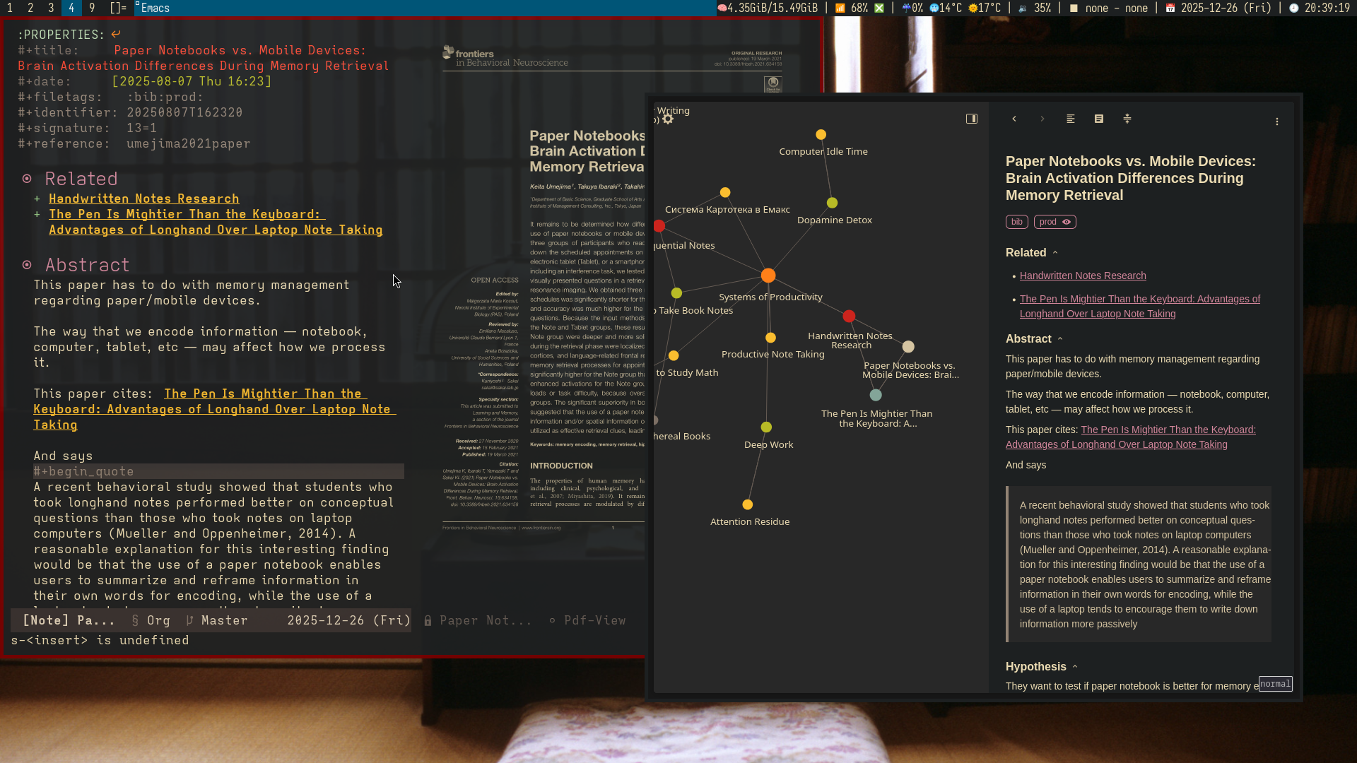 org-mode document alongside pdf with zen browser opening org-roam-ui